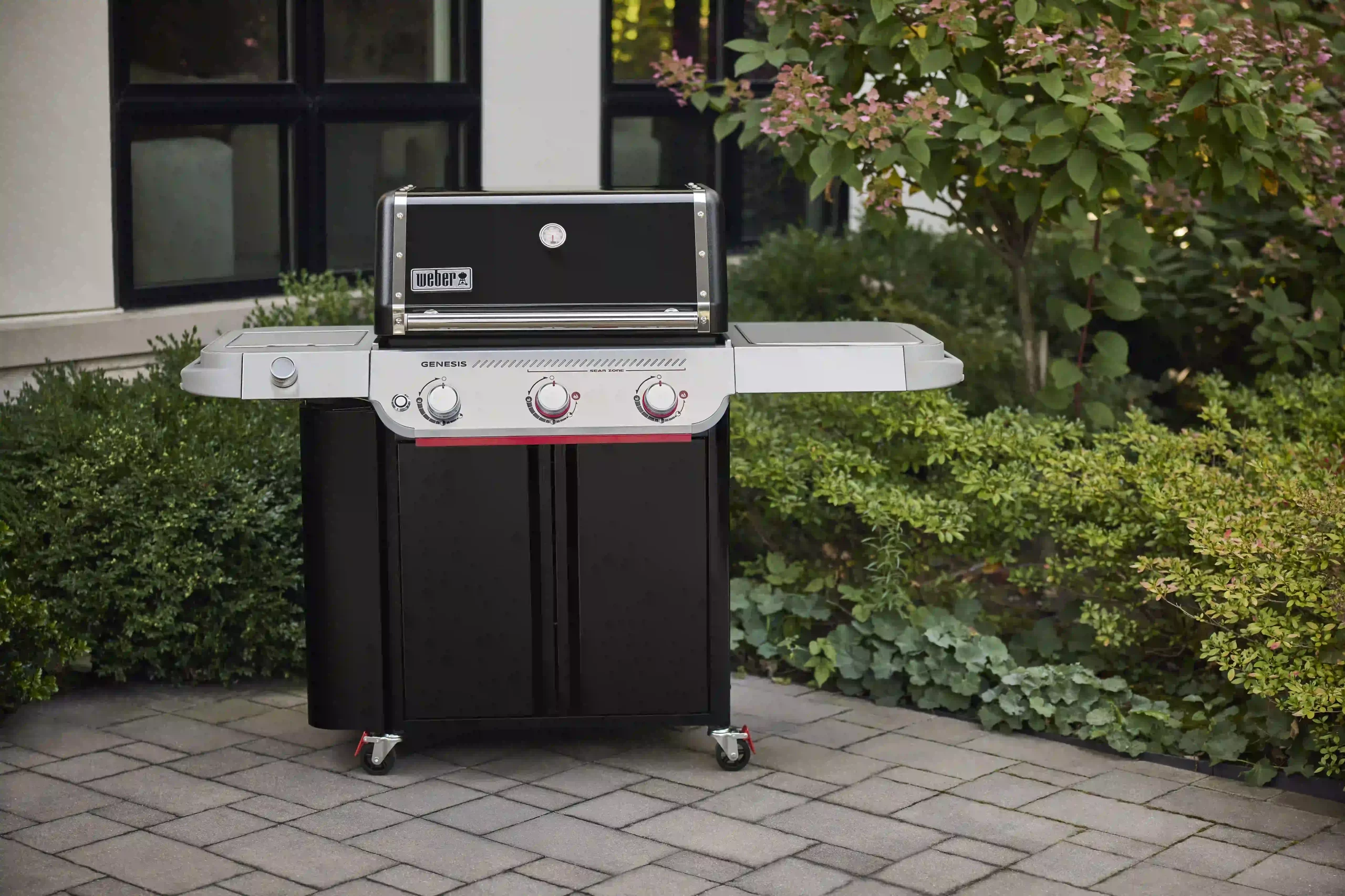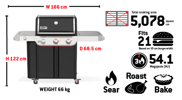 Experience powerhouse performance and precision with the upgraded Weber® Genesis® EP-335 Gas Barbecue. This premium 3-burner outdoor entertaining barbecue is perfect for large families or anyone looking for plenty of space, power and cooking versatility. Featuring a Sear Zone, side burner, grill locker, and Weber Crafted® griddle, it’s sure to be the centrepiece of your backyard. An ultra-hot Sear Zone, powered by two dual-row PureBlu™ burners, reaches ~400ºC for impressive restaurant-quality searing. The spacious cooking area heats up fast and evenly, thanks to the premium PureBlu™ burners. Heavy-duty porcelain-enamelled, cast-iron cooking grills flip over to fit Weber Crafted® cookware, giving you ultimate cooking versatility by transforming your barbecue with a griddle, pizza stone, veggie basket, and more . Plus, with Weber Works™ interchangeable accessories that drop in or snap onto the side tables, you can store, carry, prep, and serve seamlessly.